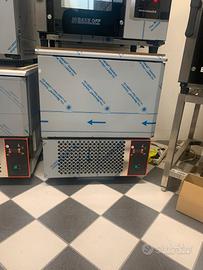 Abbattitore di temperatura 5 teglie nuovo da cm. 75x75x90h ospita sia la teglia gastronom GN1/1 sia la teglia pasticceria da cm. 60x40(teglie escluse) in dotazione vengono date 5 coppie di supporti - 230 V. - assorbimento KW. 1,4.