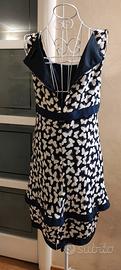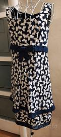 Elegante abito con fantasia di farfalle. - Fantasia di farfalle bianche su sfondo blu. - Tessuto leggero e arioso. - Modello svasato. seta
