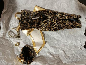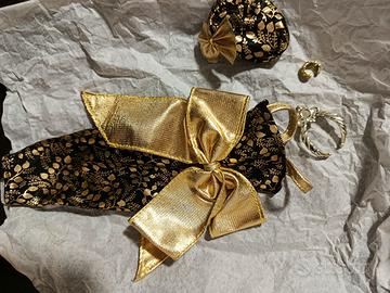 Abito per Barbie o simili composto da tubino nero e oro a fantasia,cappellino con fiocco coordinato,bracciale e girocollo. Vintage anni 90,non sono riuscita a a trovare la referenza. Nessun danno o strappo a cuciture. Bellissimo modello dal mood jazz anni 30 per arricchire la vostra collezione. Spese di spedizione da aggiungere (posteitaliane con tracciamento,circa 7-8€) No PayPal no tuttosubito