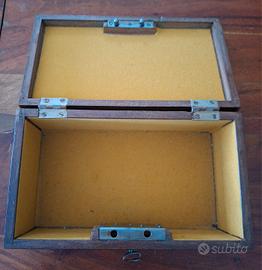 Il cofanetto è realizzato in legno con una finitura lucida, tipica di essenze come il mogano o il palissandro, comuni nel XIX e all'inizio del XX secolo. Presenta una forma rettangolare pulita con coperchio incernierato.