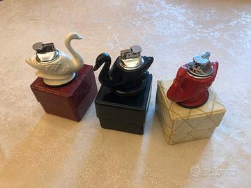 Accendini vitage a forma di cigno colori bianco rosso nero , struttura dell ‘ accendino : metallo e acciaio cromato . Finitura lucida ; il basamento del cigno é dotato di rivestimento per evitare di rigare i piani o i tavoli.