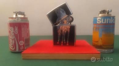 ACCENDINO ZIPPO DA TAVOLO MARCA ZORR CON CAVALLO COLOR METALLO SU SFONDO NERO, ANTIVENTO CON IL CARATTERISTICO "CLICK" E STRUTTURA COMPLETAMENTE IN METALLO.