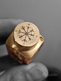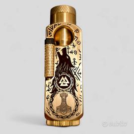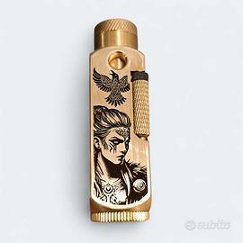Accendino da trincea in ottone lucido con incisioni profonde raffiguranti guerrieri vichinghi, navi norrene, simboli e rune.
