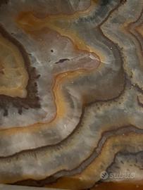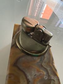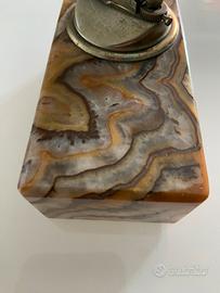 Accendino da tavolo vintage anni ‘70 in pietra dura Paesina o Diaspro Paesaggio, una roccia calcarea che presenta motivi naturali simili a paesaggi, sia alle presunte proprietà cristalloterapiche attribuite a questo minerale. Le sue presunte proprietà includono protezione per la casa e la famiglia, aumento dell'autostima e della fiducia in sé stessi, e un senso di radicamento e armonia.
