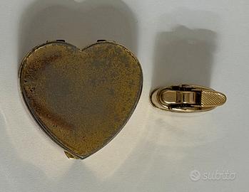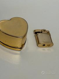 accendino Ronson vintage, specificamente un modello in miniatura spesso presentato in una custodia dorata a forma di cuore, come parte di un set regalo o di una collezione speciale denominata "Ronson mini Love".