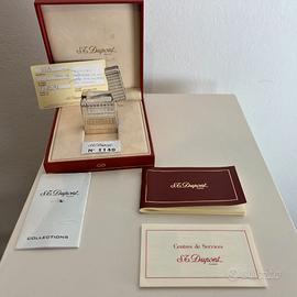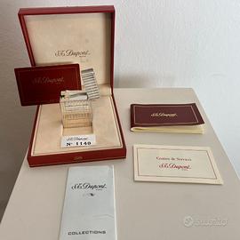 Accendino S.T. Dupont Briquet Gatsby Plaque Argent 1997 con carta di garanzia. Da collezione. Mai usato. Scatola con lievi difetti come da foto. Comprende: Scatola di cartone originale con matricola Cofanetto versione Collection bordino dorato Istruzioni libretto S.T. Dupont Carta dei Centri di Servizio Libretto S. T. Dupont Collections Accendino Briquet Gatsby Lignes Recoupees Plaque Argent Numero identificativo 1149