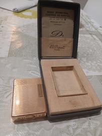 Modello della Ligne 1 (Linea 1), riconoscibile per la sua forma rettangolare compatta e solida. Presenta una raffinata placcatura in oro (spesso laminato 20 micron) con una decorazione a linee orizzontali parallele, nota anche come motivo "godronato". È presentato nella sua custodia originale, che include all'interno una brochure del "Réseau International Centres de Service" e la garanzia. FUNZIONANTE.