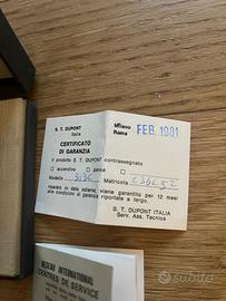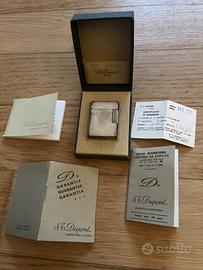 Accendino S.T. Dupont Paris originale, modello vintage anni ’80, con finitura argentata e lavorazione guilloché. Completo di scatola originale, certificato di garanzia datato FEB 1981 e documenti Dupont. Oggetto autentico e molto ricercato, ideale per collezionisti o appassionati di accessori vintage di alta gamma. Condizioni: •usato •buone condizioni generali, con normali segni del tempo •patina dell’argento presente •da pulire/lucidare per riportarlo al massimo splendore •completo di tutto il corredo originale Funzionamento non verificato recentemente, quindi per correttezza viene venduto come oggetto vintage. Per correttezza, l’oggetto viene venduto come accessorio vintage / da collezione, visto e piaciuto, senza garanzia di perfetto funzionamento.