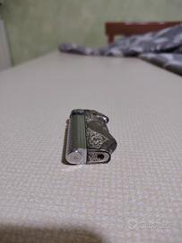 Accendino vintage a gas ricaricabile con rilievo di donna. Struttura metallica colore argento.