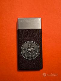 Accendino Vintage o da collezione con finitura nera "crackle" (ruvida); Caratterizzato da un rivestimento scuro con un emblema in rilievo raffigurante un cavaliere. Inspirato agli accendini Zippo.