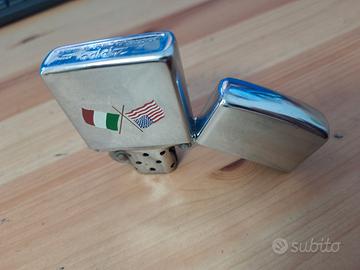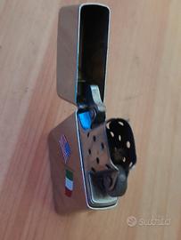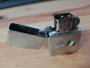 Accendino Zippo con finitura cromata lucida, caratterizzato da un emblema che raffigura le bandiere degli Stati Uniti e dell'Italia incrociate.