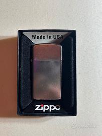 Vendo pezzo originale Zippo Slim con finitura spazzolata (Brushed Chrome). La trama a righe è la lavorazione originale di fabbrica.