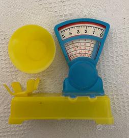Bilancia da negozio alimentari, gialla e azzurra, con piatto a ciotola e quadrante graduato