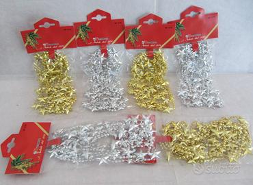 LOTTO DI 3 ARTICOLI PER ADDOBBI ALBERO DELLA SERIE MORANDUZZO: 5 BLISTER PENDENTI ORO cm. 14 cod. 611.9614.00 1 SCATOLO DA 12 SFERE GIOSTRINE cod. 613.2833.00 6 BUSTE CATENE CON STELLE cm. 270 (3 ORO e 3 ARGENTO cod. 411.9846.00
