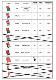 Accessori per modellismo navale Amati, nella lista è riportato l'articolo, le quantità disponibili, il prezzo di listino ed il prezzo scontato riferito al singolo pezzo e dove specificato alla confezione.