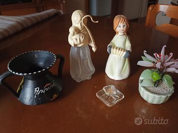 Componenti per creazioni di presepi artigianali. Piccola Cesta in vimini, statuina angelo con fisarmonica in ceramica, vaso anfora in creta( scheggiata), pianta frutto in ceramica, mignon bottiglia porta essenze, statuetta pastorella in plastica e vetro, mini bauletto/ scatola scrigno in legno con interno in vellutino, mini composizione di fiori / secchi cespuglio che sembrano lingue di fuoco ardente; porta candela in ottone, porta vaso in ottone battuto, mini anfora e secchio in ottone; kit bustine di erba , sabbia, sassolini e neve finta.