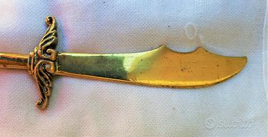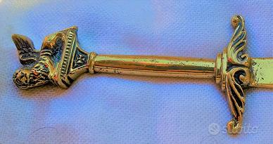 Raro e “celebre” tagliacarte d'epoca fascista commemorativo dei “Fucilieri del Battaglione San Marco” realizzato in “finissimo” ed elegante ottone nei primi anni '30. La “celebrità” di questo tagliacarte, risale al fatto che una copia “medesima” fu donata alla contessa Edda Mussolini in Ciano, figlia prediletta del DVCE, in occasione della sua visita “ufficiale” al Corpo dei Fucilieri del San Marco, avvenuta in data 21 aprile 1932, in occasione del Natale di Roma. L’affascinante cimelio raffigura nell’impugnatura un piedistallo dove poggia sulla testa il simbolo del San Marco ovvero un "leone alato" posto a guardia o protezione, con sotto una croce di forma “teutonica”. La “guardia” del cimelio è realizzata con un bel disegno di ghirigori dal tema antico ed infine il tagliente, assume la forma delle scimitarre dentate di gusto orientale. L’affascinante cimelio si presenta in "OTTIME" condizioni di conservazione senza mancanza, rottura e/o difetto alcuno e si pone come un’importante “FONTE MATERIALE” storica del periodo predetto. Misure: lunghezza complessiva = 225 mm; solo lama = 120 mm; larghezza massima = 58 mm; peso = 136 grammi.