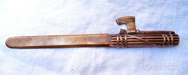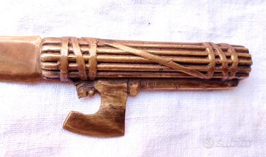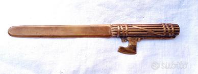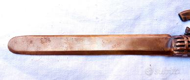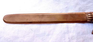 Tagliacarte d'epoca fascista della seconda metà degli anni '30. Il cimelio in argomento è stato realizzato interamente in bronzo, poi bagnato nell’oro “povero” e presenta l’impugnatura a forma di fascio littorio stile "IMPERO". L'affascinante "FONTE MATERIALE" del Ventennio fascista italiano si presenta in “ECCELLENTI" condizioni di conservazione, "genuino" ed "intonso" senza ne mancanza, rottura e/o difetto alcuno. Misure: lunghezza complessiva = 230 mm; solo tagliente = 135 mm.