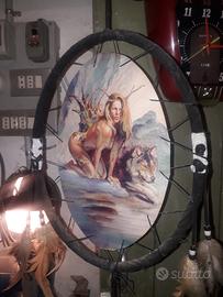 acchiappasogni stile indiano con dipinto di Boris Vallejo, ragazza elfo con lupo dream catcher