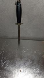 Affilacoltelli con manico in plastica e asta in metallo. - Manico nero con anello per appenderlo. - Asta in metallo argentato.