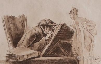 Acquaforte umoristica con un uomo seduto, chino su un libro con una lente di ingrandimento, mentre sullo sfondo una giovane ragazza è in piedi in modo provocante, con i seni e la schiena scoperti. Firmato e datato "FR/ 84. In basso al centro: De Castitate! Le Traité de la Chasteté. Dimensioni grafica 15,5 x 11,5 cm. In cornice 35 x 30 cm.