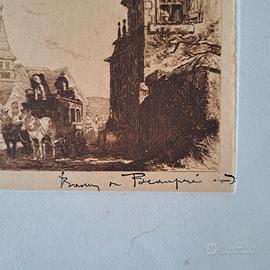 L'opera raffigura una scena rurale o una strada di villaggio animata da diverse figure umane e, in alcuni esemplari simili, animali come cavalli.