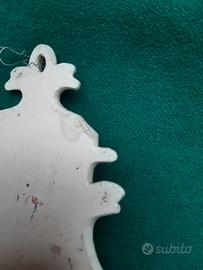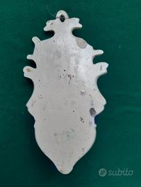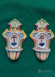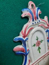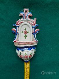 Acquasantiera in ceramica motivo fiori rosa dipinta a mano. Dimensioni cm. 19,5 x 10. Manca pezzetto in alto a sinistra come da foto allegata. Le foto fanno parte integrante della descrizione . Ho anche coppia di acquasantiere in altro annuncio non comprese in questa vendita (vedere ultima foto)