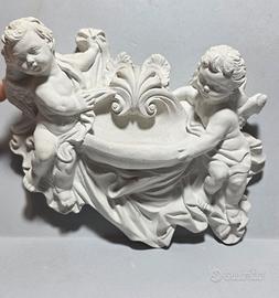 Acquasantiera da parete con due angeli putti im gesso bianca, '900.