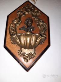 Acquasantiera in bronzo su base legno, meta 800, h 20cm. circa.