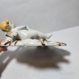 Acquasantiera in ceramica bianca e oro con putto, XX secolo.