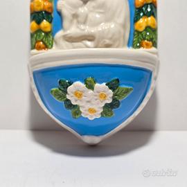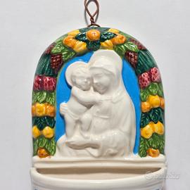Bell'acquasantiera raffigurante Madonna con bambino con la corona di fiori e colori vivaci in stile Robbiano prodotto dalla Giara Umbria misure 14.5* 9* 6.5 cm circa probabilmente risalente alla seconda metá del XX secolo.