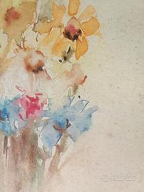 Delicato dipinto floreale realizzato a mano con tecnica ad acquerello su carta. L’opera, firmata in basso a sinistra, presenta una composizione eterea di fiori colorati, ideale per arredamenti in stile classico, shabby chic o rustico.