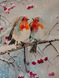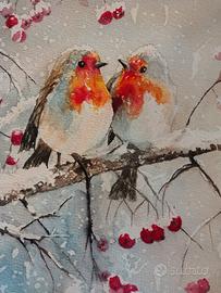 Acquerello. Pettirossi tra la neve