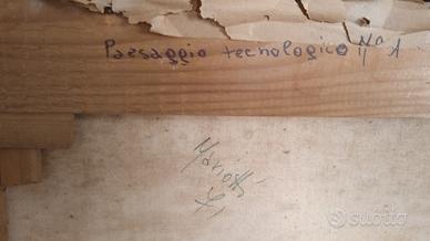 Artista di Genova di metà novecento. Il quadro intitolato Paesaggio tecnologico 1 presenta macchie di umidità e un taglio sulla tela in alto di 1,5 cm. Necessità di restauro. Se interessati, ritiro a mano a Torino.