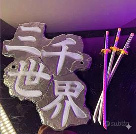 Accessori inclusi: Set completo di 3 katane e base espositiva unica con ideogrammi giapponesi in rilievo.
