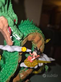 Vendo questa magnifica statua da collezione che raffigura una delle scene più iconiche dell'universo di Dragon Ball: il potente drago Shenron avvolto su se stesso tra le nuvole, con il piccolo Son Goku appoggiato delicatamente sulla nuvola speedy.