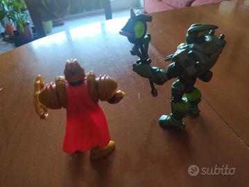 Due action figure di guerrieri. - Un guerriero verde con scudo e bastone. - Un guerriero dorato con scudo e mantello rosso.