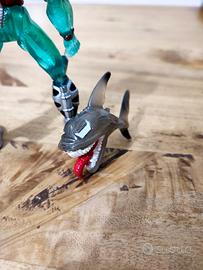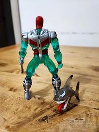Questa versione fa parte della storica linea Spider-Man Animated Series (anni ’90), ispirata ai numerosi varianti tematiche create da Toy Biz, e la particolarità di questo modello è il corpo traslucido verde acqua, con dettagli in argento metallizzato e accessori subacquei come il Tridente/arpione e lo squalo grigio con lingua rossa.