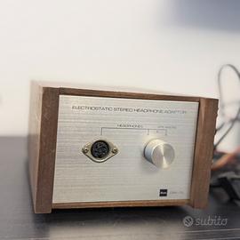 Adattatore trasformatore per cuffie elettrostatiche Elega CR-70. È dotato di selettore per passare tra "Headphones" (Cuffie) e "Speakers" (Altoparlanti). Possiede alloggiamento in legno e corpo in metallo. Bellissimo pezzo vintage. Funzionante. 22x14x10