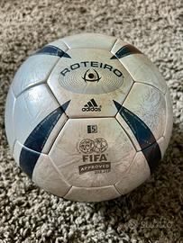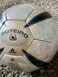 Pallone da calcio ufficiale da gara Fifa Approved Adidas Roteiro degli Europei 2004 in Portogallo. Pallone vintage mai utilizzato per giocare ma che porta qualche segno del tempo. (Forse con una pulizia profonda i segni sul pallone possono andare via). Pezzo raro da collezione, scambio a mano in Grugliasco-Collegno o spedizione tramite TuttoSubito