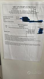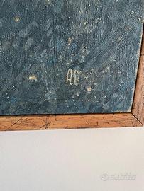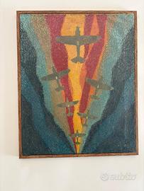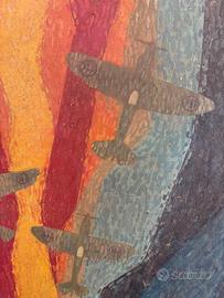 Dalla mia collezione vendo splendido olio su tela (70x60 cm) raffigurante caccia italiani Macchi C.202 in volo, piena estetica Aeropittura Futurista. L'opera è di assoluta autenticità d'epoca (prima metà del XX secolo), come certificato dai documenti presenti sul retro: Foglio di aggiudicazione Casa d'Aste 'Art International'. Timbro originale 'Galleria d'Arte Dozza' (Bologna). Il quadro presenta la firma 'AB' in basso. La fattura è eccellente, con colori vivaci e una dinamica tipica delle opere d'aviazione del periodo bellico (1941-1943). Un pezzo da collezione ideale per investitori in arte del Novecento o collezionisti di militaria aeronautica."