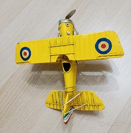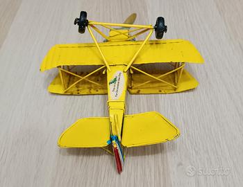 Vendo aeroplano in metallo giallo, stile vintage, in buone condizioni..presenta segni di ruggine e qualche scollatura che si può facilmente riparare ...le rotelle camminano e l'elica gira.