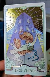 Ätherische Visionen Das illuminierte Tarot, versione tedesca: mazzo di carte completo + 2 Arcani Maggiori creati dall'autore + libretto in tedesco Mazzo di alto livello artistico, con bassorilievi su doppio cartoncino in foglia d'oro, ispirato all'Art Nouveau fin de siècle/Sezessionstil austriaco degli anni 1890-1910, sullo stile di Mucha.