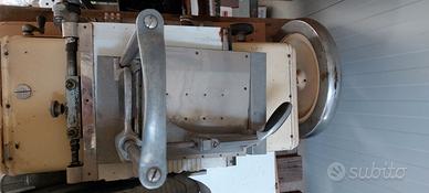 Vecchia e antica Affettatrice a Volano, anni 40-50 circa. Molto grande e pesante, colore bianco panna, da revisionare o restaurare, ma una volta pulita, fa una gran bella figura, anche esposta in una gastronomia o ristorante. Piatto in marmo, con crepa. Ritiro da Parte Vostra al mio indirizzo.