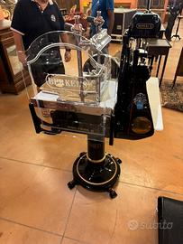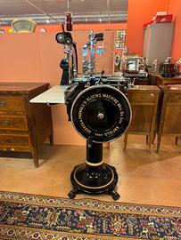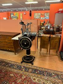 -Restaurata, restauro di altissima qualità, l’affettatrice viene tutta smontata, i pezzi in ghisa vengono sabbiati poi portati in carrozzeria dove vengono stuccati, verniciati, decorati e applicata una vernice trasparente per proteggere le decorazioni e la vernice, i pezzi in ferro e alluminio vengono lucidati e ricromati, se irriparabili addirittura cambiati, come i cuscinetti e la lama, in fine la affettatrice viene tutta rimontata e collaudata, da un esperto professionista