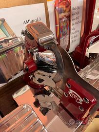 -restaurata, restauro di altissima qualità, la affettatrice viene tutta smontata, i pezzi in ghisa vengono sabbiati poi portati in carrozzeria dove vengono stuccati, verniciati, decorati e applicata una vernice trasparente per proteggere le decorazioni e la vernice, i pezzi in ferro e alluminio vengoni lucidati e ricromati, se irriparabili addirittura cambiati, come i cuscinetti e la lama,in fine la affettatrice viene tutta rimontata da un esperto professionista