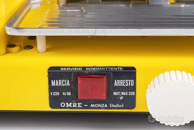 ▸ Affettatrice domestica italiana degli anni Settanta, con la tipica estetica pop del periodo: colore deciso, linee nette, presenza scenica importante in cucina.