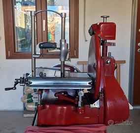 Affettatrice a volano Adalberto Confalonieri, modello d'epoca prodotto a Monza, Italia, dall'Officina Meccanica Rapid. La macchina è funzionante in tutte le sue parti meccaniche (volano, carrello, lama). Presenta segni del tempo e dell'usura (come visibile in foto), con graffi, sbeccature nella vernice e segni di ruggine superficiale in alcuni punti.