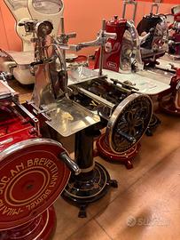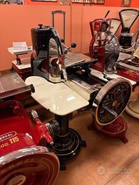 restauro di altissima qualità, la affettatrice viene tutta smontata, i pezzi in ghisa vengono sabbiati poi portati in carrozzeria dove vengono stuccati, verniciati, decorati e applicata una vernice trasparente per proteggere le decorazioni e la vernice, i pezzi in ferro e alluminio vengono lucidati e cromati, se irriparabili addirittura cambiati, come i cuscinetti e la lama, in fine la affettatrice viene tutta rimontata da un esperto professionista.
