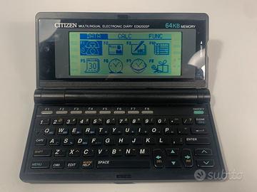 Agenda elettronica Citizen Multilingual Electronic Diary ED6200SP –, perfettamente funzionante. Buone condizioni estetiche con normali segni del tempo come da foto, testato in ogni sua componente. Dispositivo compatto anni con tastiera QWERTY, ideale per gestione contatti, calendario, promemoria e calcolatrice integrata. Perfetto per organizzarsi senza carta, tenere tutto in un unico dispositivo e avere sempre dati e appuntamenti a portata di mano. Modello interessante per collezionisti e appassionati di elettronica vintage per uso quotidiano 📦💨 Spedizione rapida e tracciata con imballaggio ben protetto e isolato Per info, altre foto o video scrivimi pure